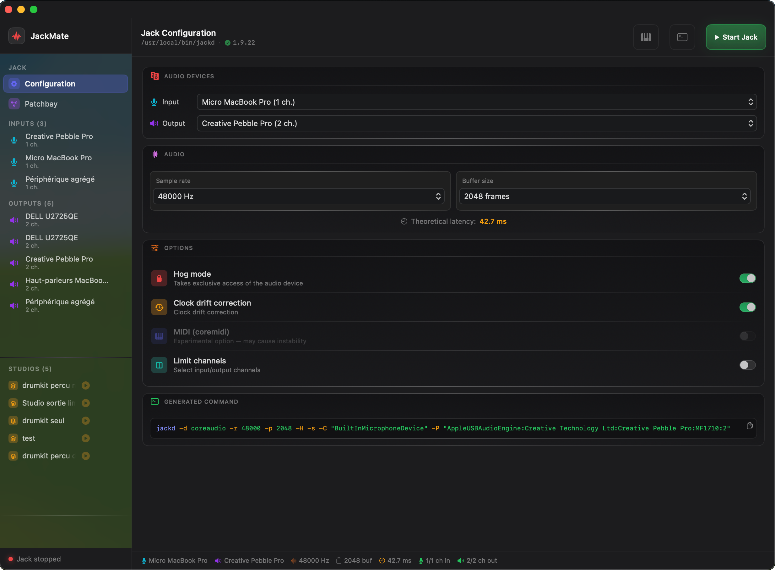 Select audio interfaces, sample rate and buffer size. JackMate computes compatible sample rates in real time and generates the exact jackd command — no terminal required. Hog mode, channel selection, aggregate device support, and a live latency readout.