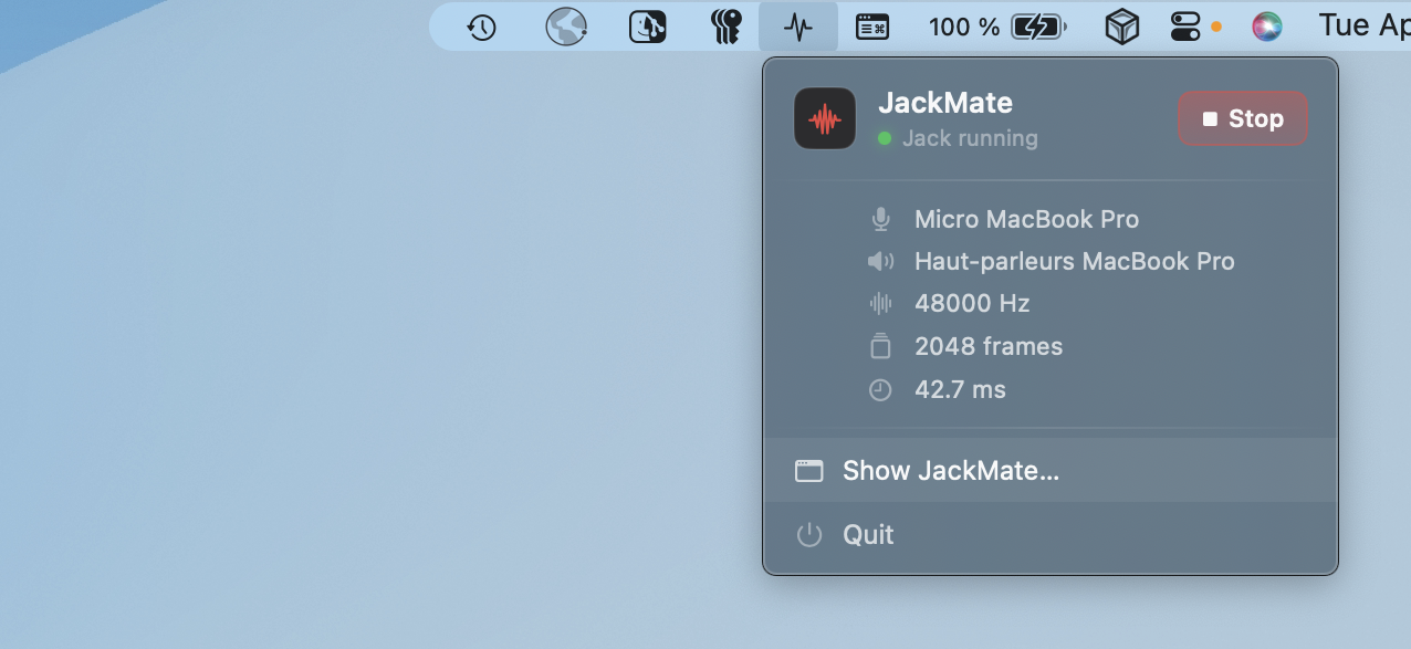 JackMate lives in your menu bar. Start and stop Jack, load a studio, check the xrun count and current latency — even with the main window closed. A single icon, always within reach.