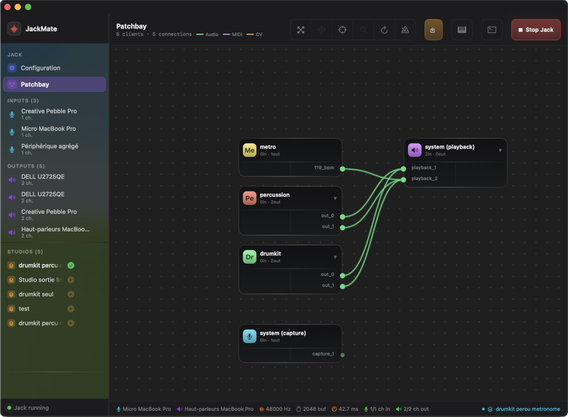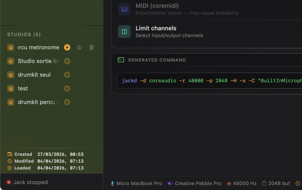 Save the complete state of your patchbay — connections, node positions, Jack config, and CLI client commands — as a named Studio. Load in one click. JackMate restarts Jack only when the configuration has changed, and relaunches every CLI client automatically.