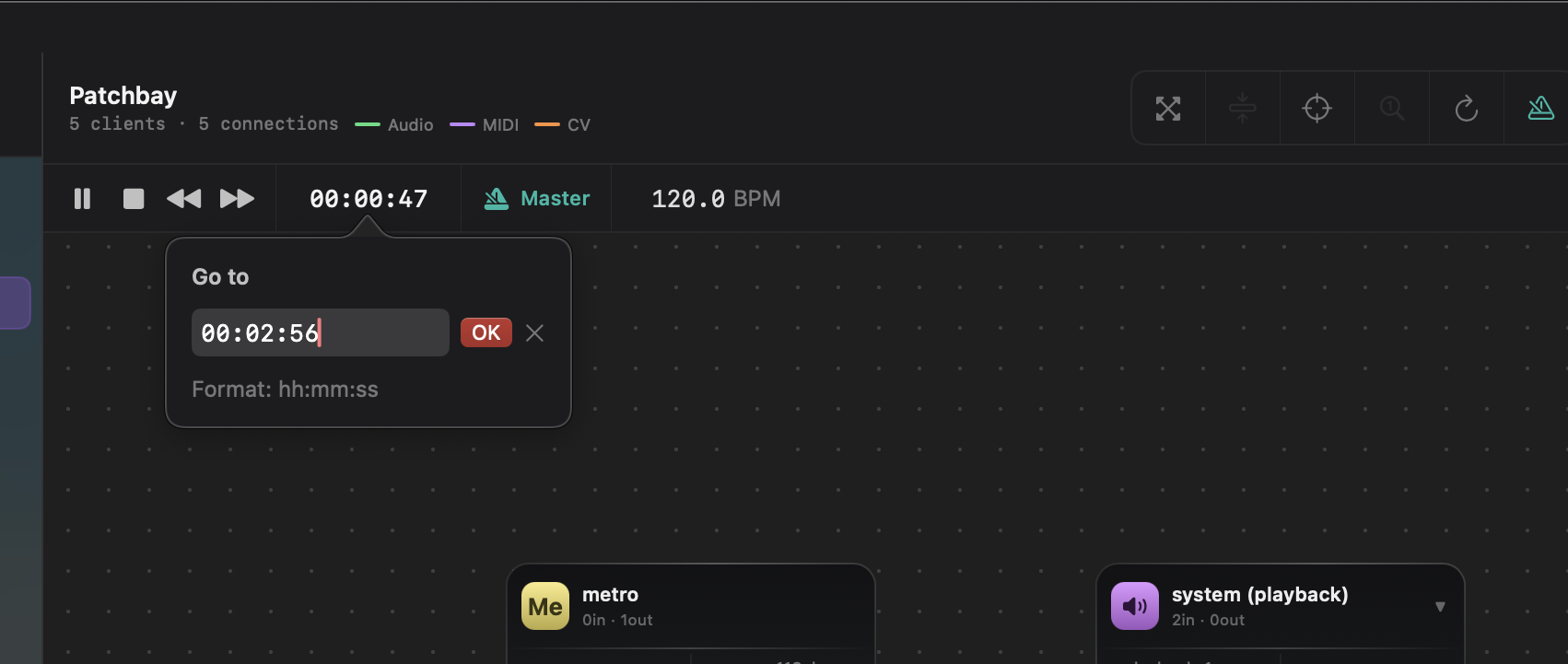Play, pause, stop, and seek from the patchbay toolbar. Display position as BBT, timecode or frames — click to cycle. Set BPM and claim the Jack timebase master role to drive every connected DAW in perfect sync.