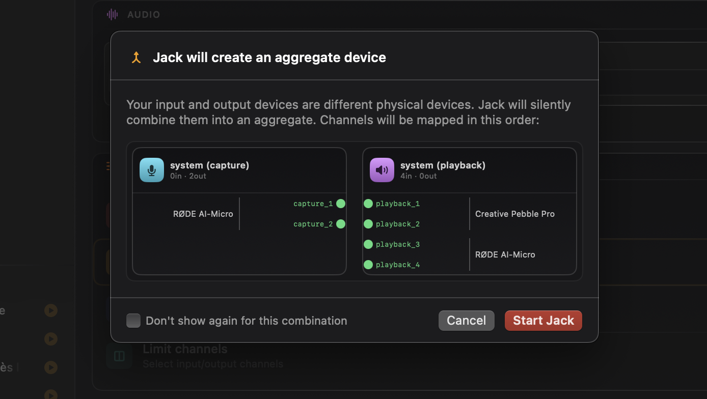 Jack only starts after you confirm. A “Don’t show again for this combination” option suppresses the warning for that specific device pair.