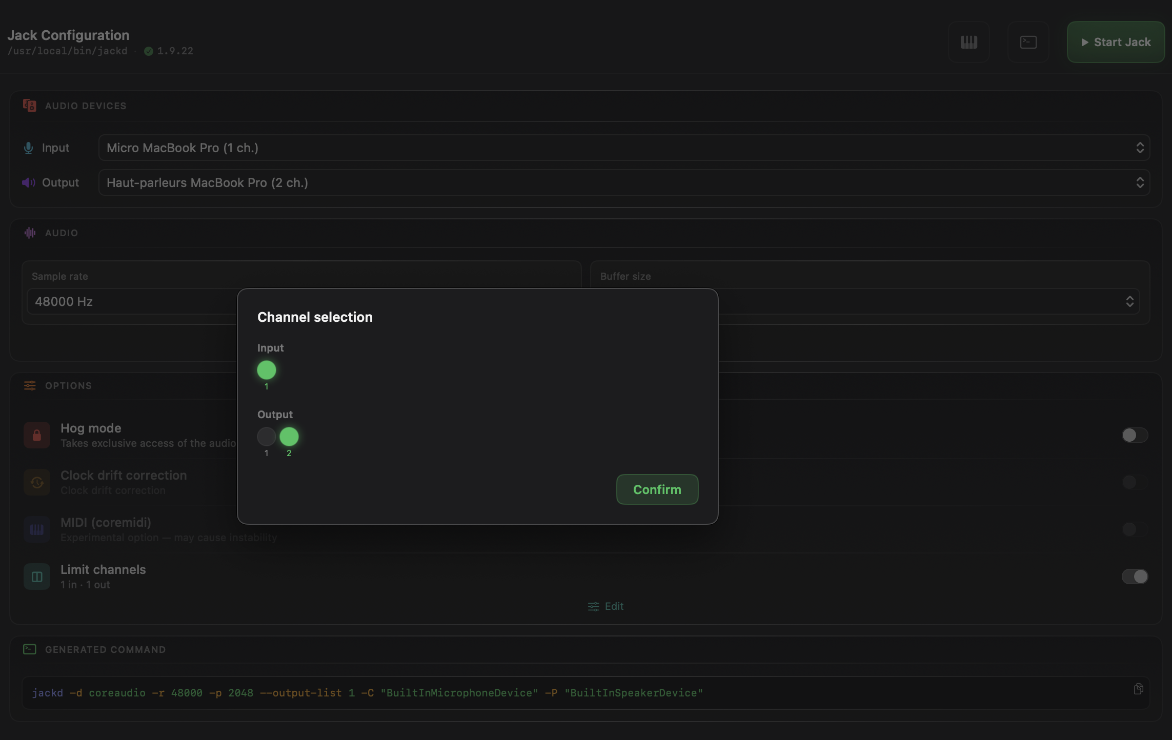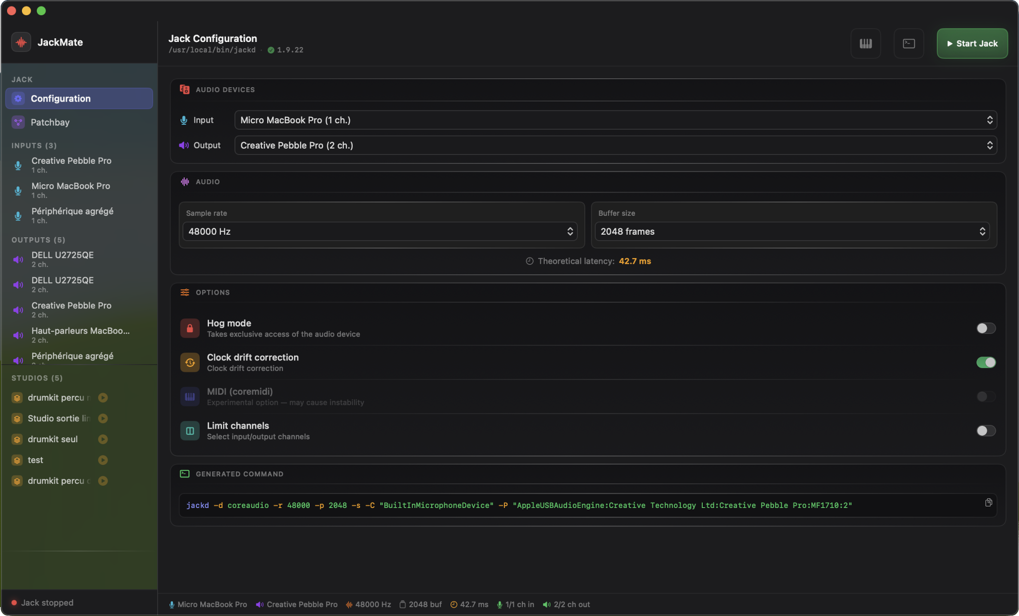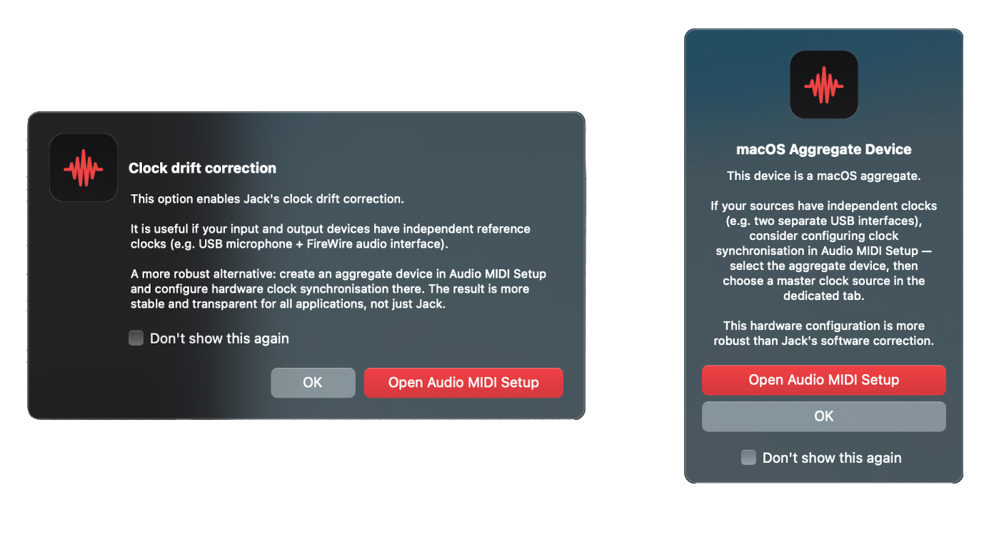 When activating Clock Drift Correction with non-aggregate devices — JackMate suggests using a macOS aggregate device instead, which handles clocking at the OS level and is generally more reliable than Jack’s software correction.