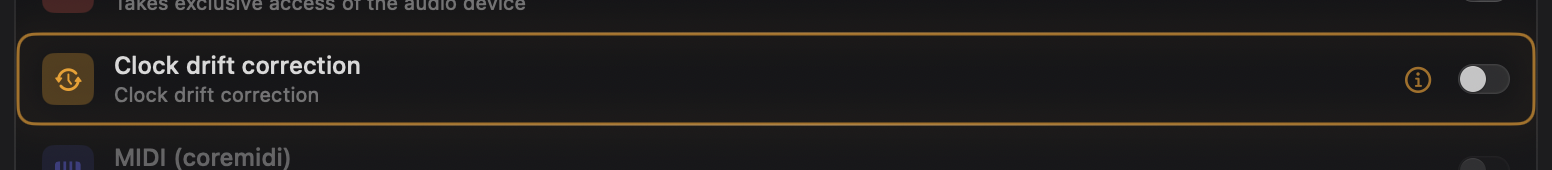 Clock drift correction is automatically disabled (and forced off) when input and output are the same physical hardware (same UID, or both built-in devices). In that case the toggle is greyed out.