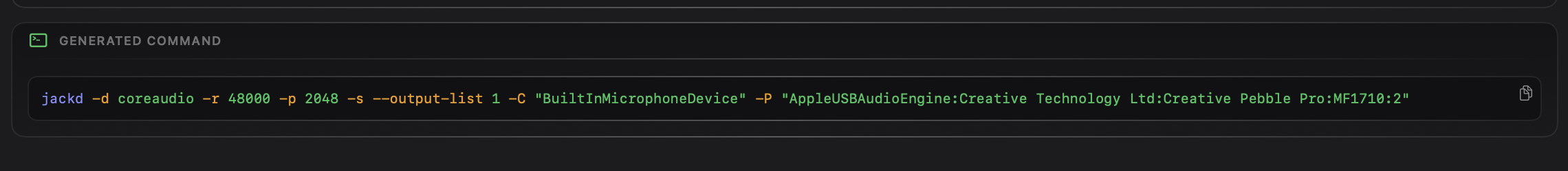 The Generated Command section shows the jackd command JackMate will execute, updated in real time as you adjust parameters. Useful for debugging or copying into a script.