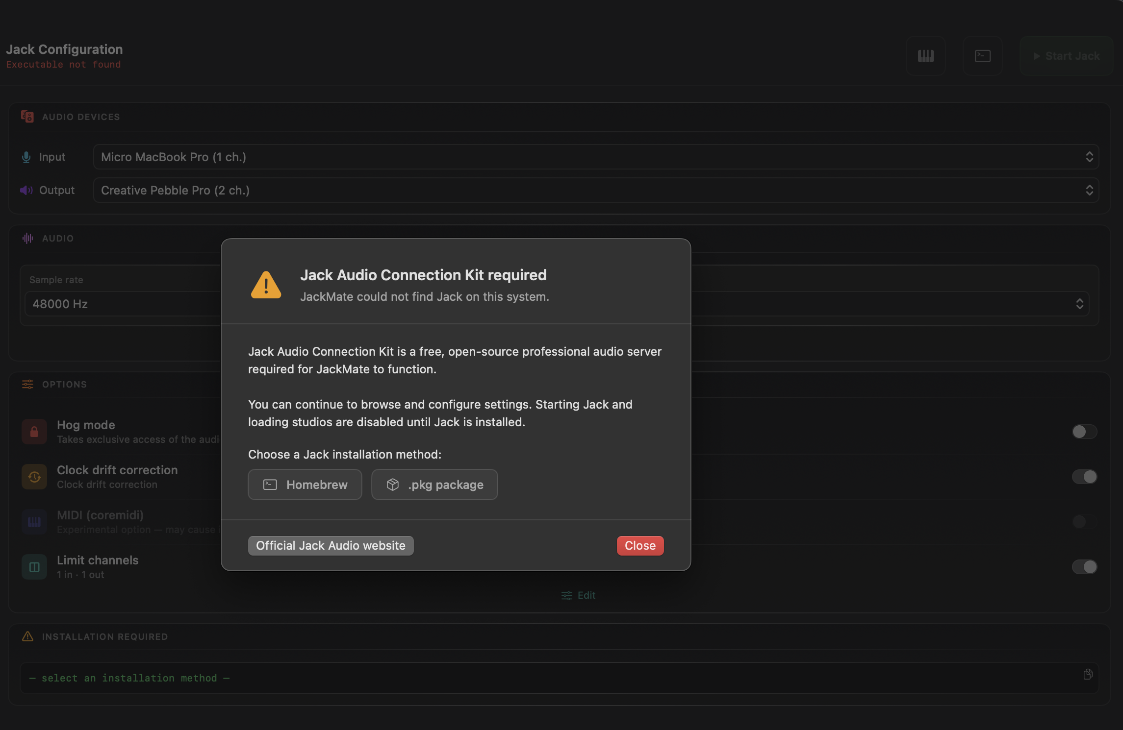 If Jack is not found at launch, JackMate shows an installation guide modal with the appropriate command (Homebrew or .pkg download), coloured glow highlighting the command block. The Start Jack button is disabled until Jack is installed.