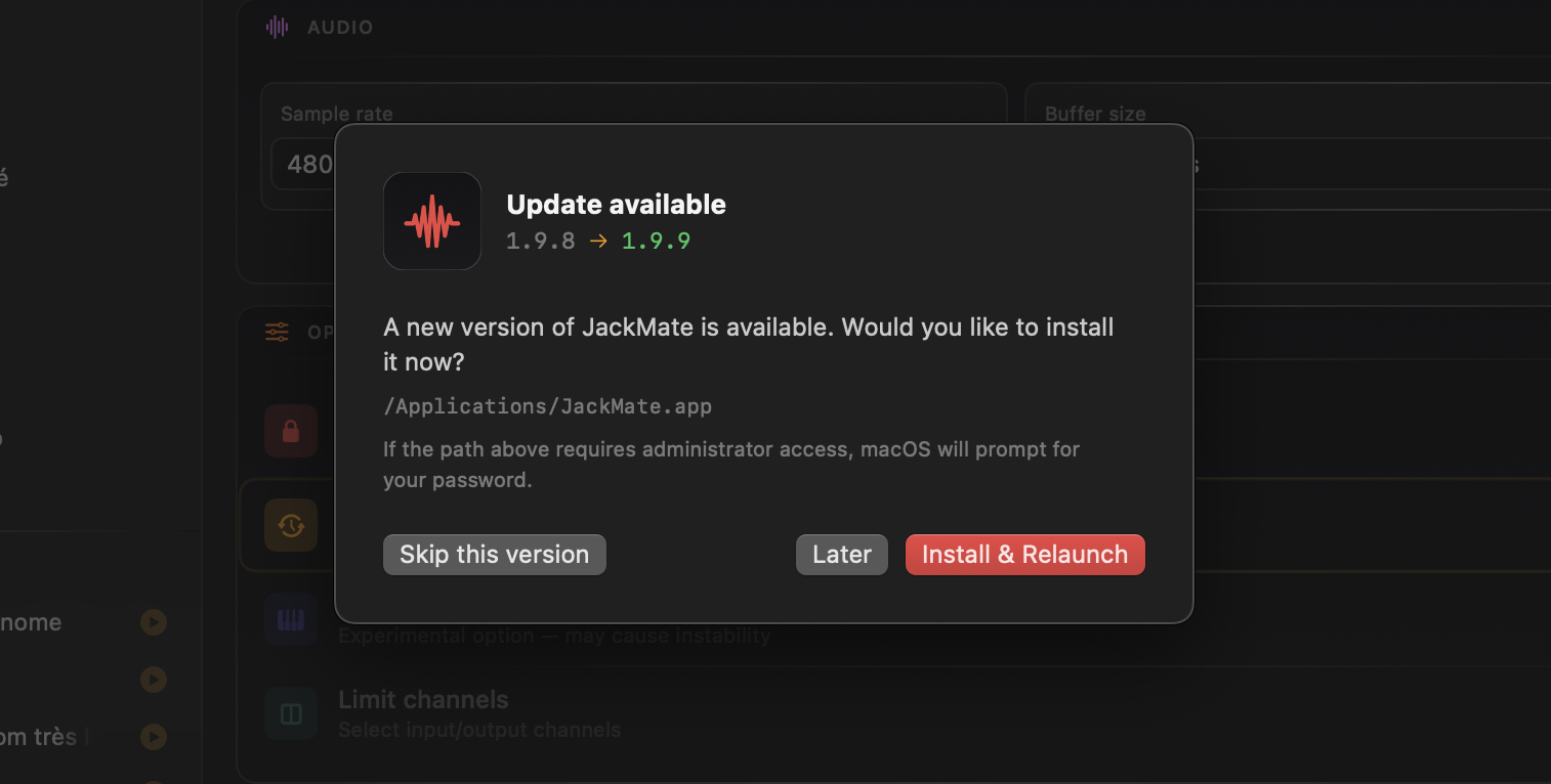 JackMate checks for new releases at launch (against GitHub releases, 24h cache — silent if no network). If a newer version is available: