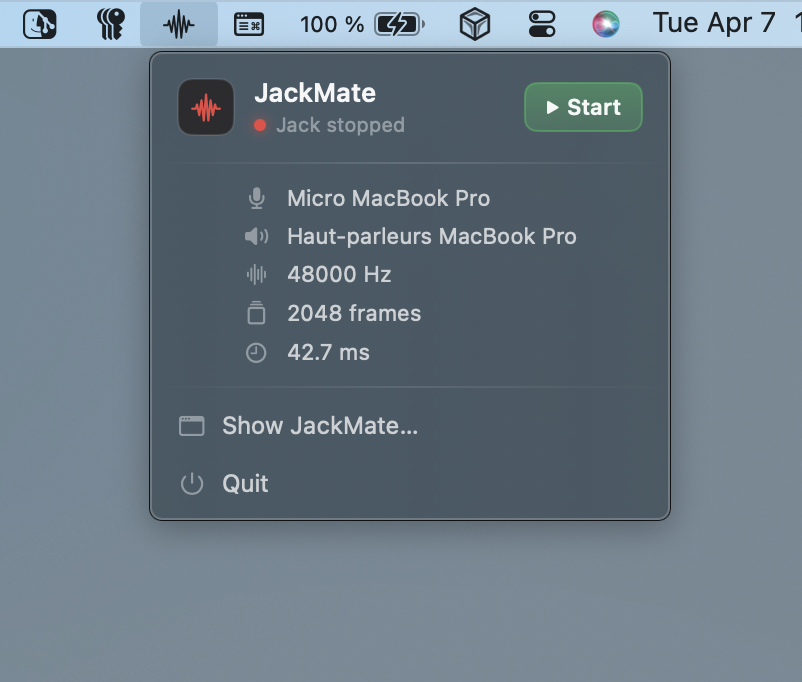 Once configured, JackMate will be available in your menu bar from the moment you log in — ready to start Jack whenever you need it.